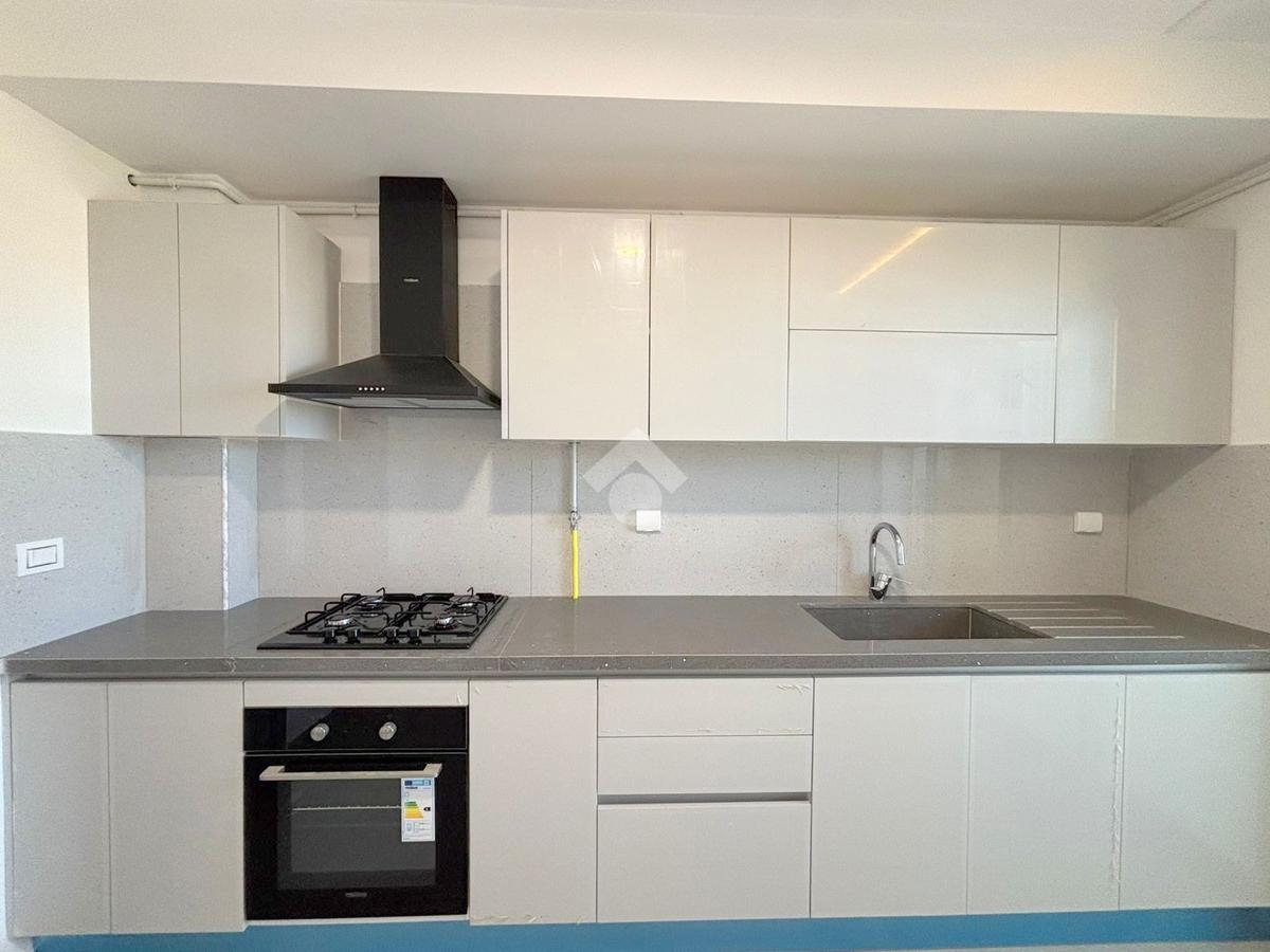 La cuisine est équipée par les éléments de rangement, une plaque, une hotte aspirante et un four électrique.